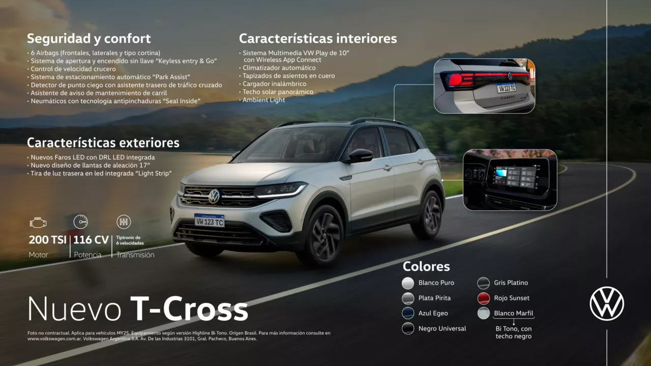 El nuevo T-Cross llega con un diseño renovado, con motor 170 TSI y 200 TSI para más potencia. 6 airbags para el conductor, para el acompañante y otros de cortina para pasajeros delanteros y traseros.